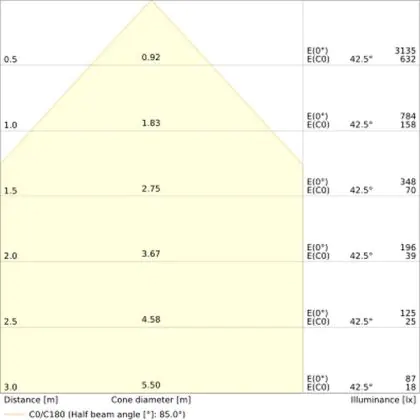 De gradenbundel geeft informatie over hoe breed het licht wordt uitgestraald. Dit zit tussen de 0 en 360 graden (D). Hoe kleiner de hoek, hoe specifieker de lichtbundel is. Over het algemeen is een smalle gradenbundel perfect voor sfeer- of accentverlichting, terwijl een brede gradenbundel ideaal is om grote oppervlaktes te verlichten.