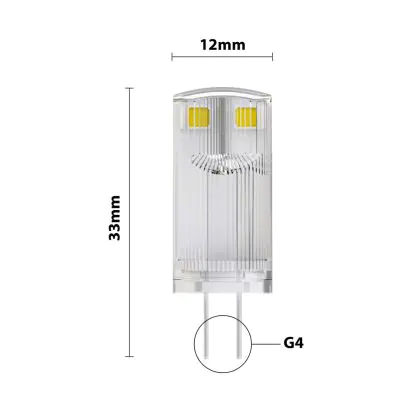 Door het kopen van dit product haal je in vergelijking met een G4 halogeenlampje duurzame verlichting binnen. Daarnaast is LED veel beter voor het milieu, omdat er geen giftige stoffen in zitten. Wel raden we je aan om de afmetingen van je huidige G4 lamp te vergelijken met die van deze G4 LED lamp. De diameter van dit product is: 12mm en de hoogte is: mm. Op deze manier weet je zeker of dit steeklampje wel/niet in het armatuur past. Wil je een overzicht van al onze G4 LED lampen zien? Klik dan hier.