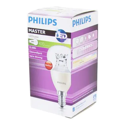Beschrijving Philips MASTER LED Lustre E14 Kogel Kroon Helder 5.5W 470lm - 822-827 Dim To Warm | Dimbaar - Vervangt 40W